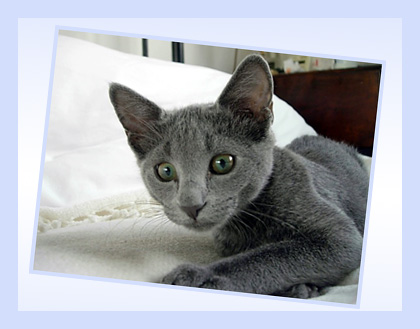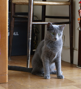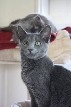 Fëanor dont le nom veut dire Esprit de Feu (en langage elfique chez JRR Tolkien) est une Bleu Russe Variante. Avec son éleveur, nous avons longtemps cru qu’elle était Nebelung mais non, tant pis. Elle va énormément apporter au pool génétique du Nebelung. Et quand sera venu le moment, elle ira rencontrer un beau matou Nebelung pour donner naissance – statistiquement - à 50% de bleu russes variants et 50% de Nebelung. Ce sera la pochette surprise de fin 2011 ! Fëanor est la joie de vivre personnifiée ! Toujours gaie et de bonne humeur, prête à jouer, elle participe activement à la vie de la maison. Pour une raison qui m’est totalement inconnue, elle adore me voir me laver les dents !!! Mdrrr Mais elle tient aussi à ses câlins qu’elle vient réclamer, que dis-je, exiger tous les jours.